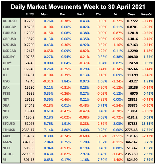 As the month closed (Monday is a holiday), last week was the final week of May. Markets moved up on Monday, perhaps after cryptos stabilised at the weekend, and held their position in a narrow trading range all week, after Fed Clarida said he thought the current inflation level was “transitory”, and despite Fed Daly and Quarles confirming that tapering was on the agenda.